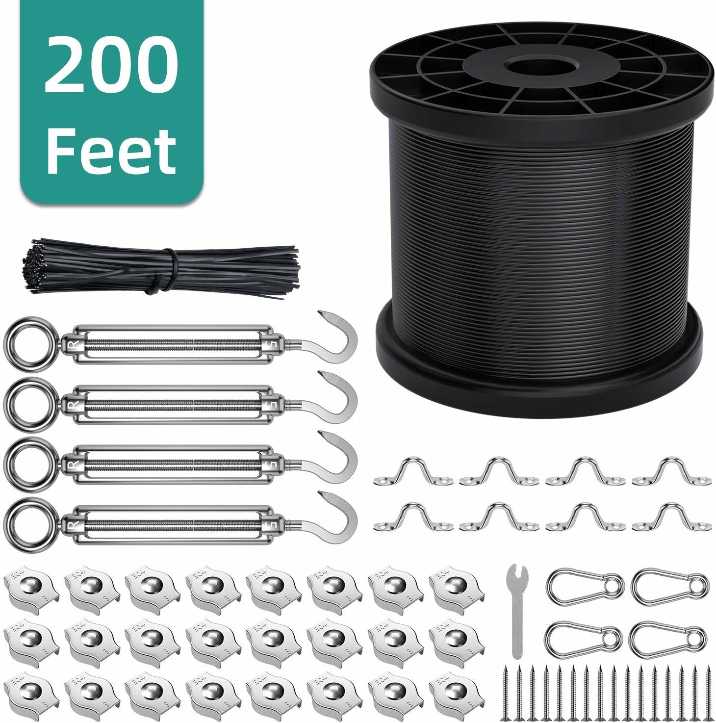 Lumières de ficelle de LKS accrochant le kit, câble facile de suspension de lumières d'installation de 200ft, kits Vinyle-enduit de fil d'acier inoxydable de noir universel 304 pour le patio et la piscine d'arrière-cour